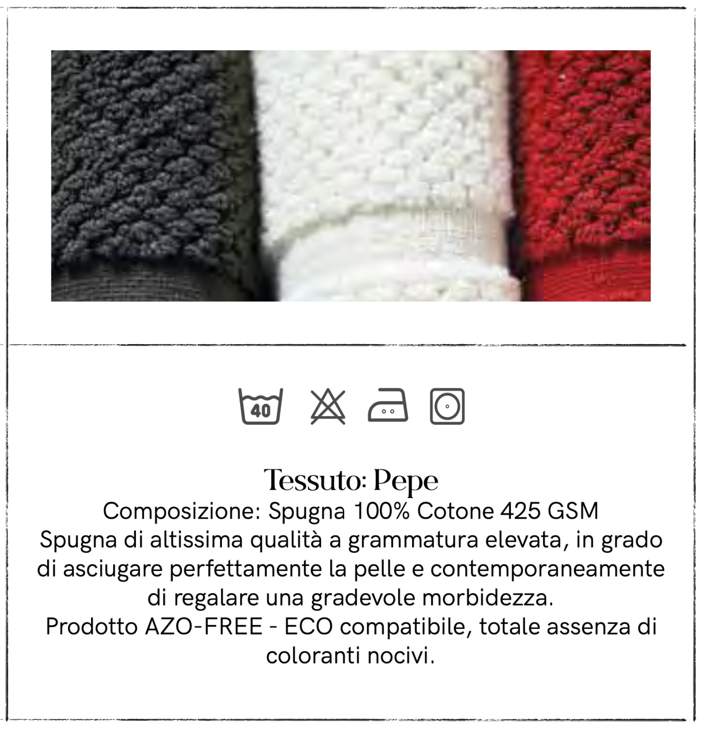 Composizione: Spugna 100% Cotone 425 GSM Spugna di altissima qualità a grammatura elevata, in grado di asciugare perfettamente la pelle e contemporaneamente di regalare una gradevole morbidezza.
